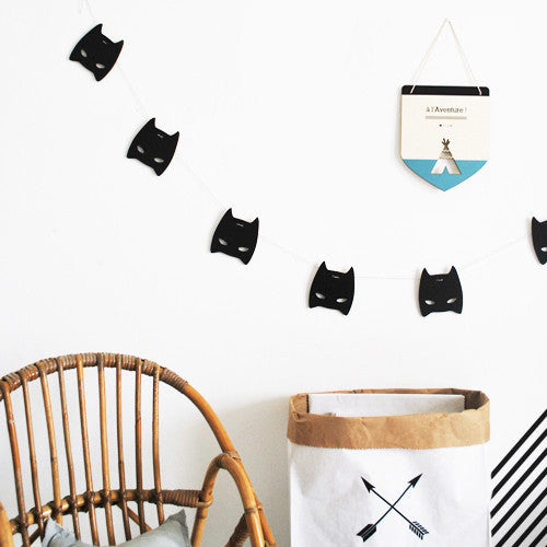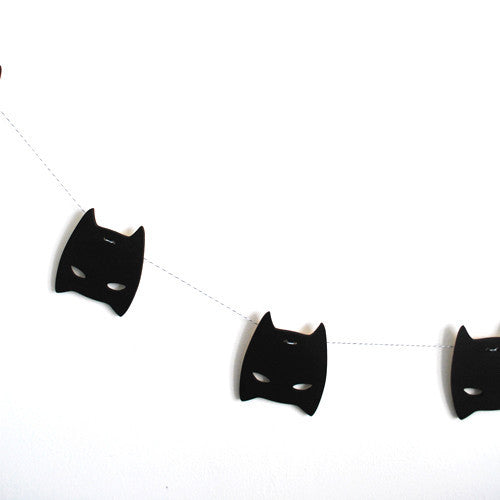 6 hanging wooden batman shaped mask on grey and white striped twine.